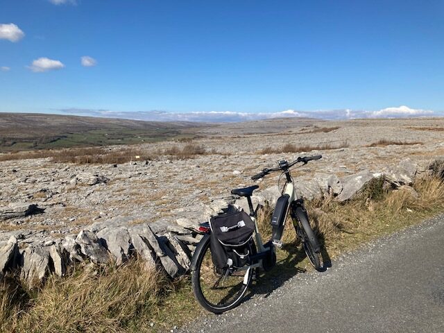 Our e-bikes are top of the range pedal assist electric bikes, designed for our small local roads with puncture resistant tyres and 3 or more levels of power assist. They are all ‘step-thru’ models, making them easy to get on and off, and have hydraulic brakes and carriers to take panniers or bike bags. We provide helmets, locks and small pannier bags to carry your essential items for a great day out in the Burren.